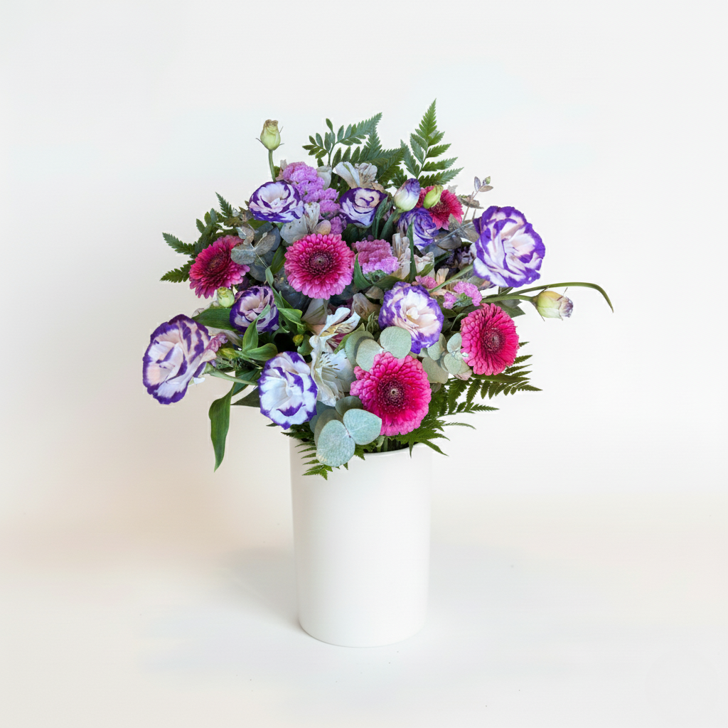 זר פרחים עשיר, דרמטי ורומנטי להפליא, המעוצב בהרמוניה מושלמת של ניגודים. השילוב בין הגוונים הוורודים והסגולים העזים של הפרחים לבין הכחול העמוק של האריזה, יוצר מראה יוקרתי ומודרני שקשה להתעלם ממנו. זהו זר שיוצא מהקופסה של "רק ורדים אדומים" ומשדר עומק, ייחודיות ותשוקה.