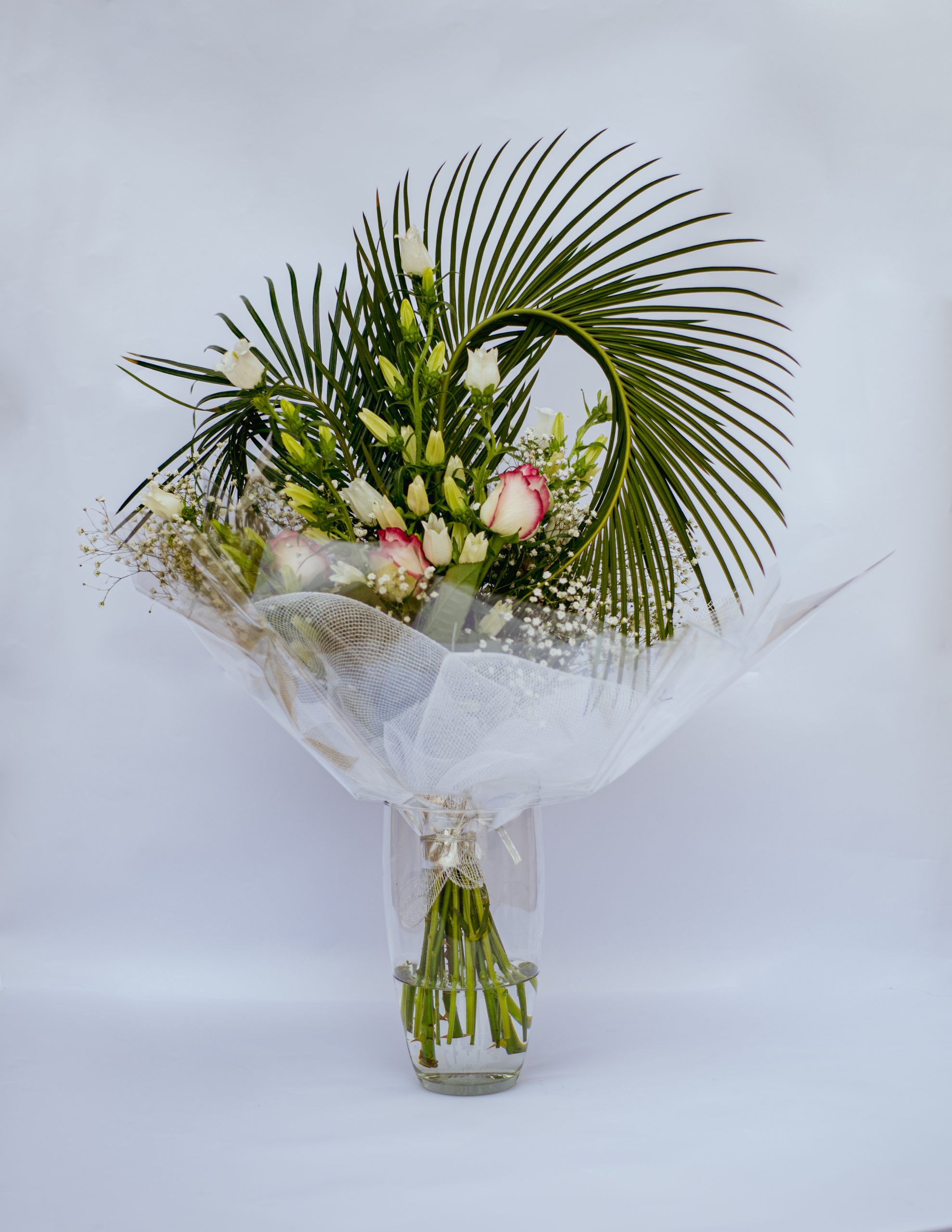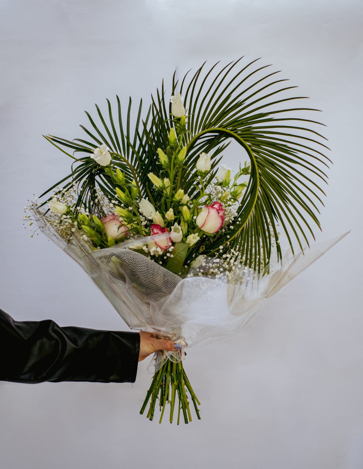 זר פרחים יוקרתי, מרשים וקלאסי, המשלב בין עדינות הפרחים הלבנים לנוכחות דרמטית של עלים ירוקים.